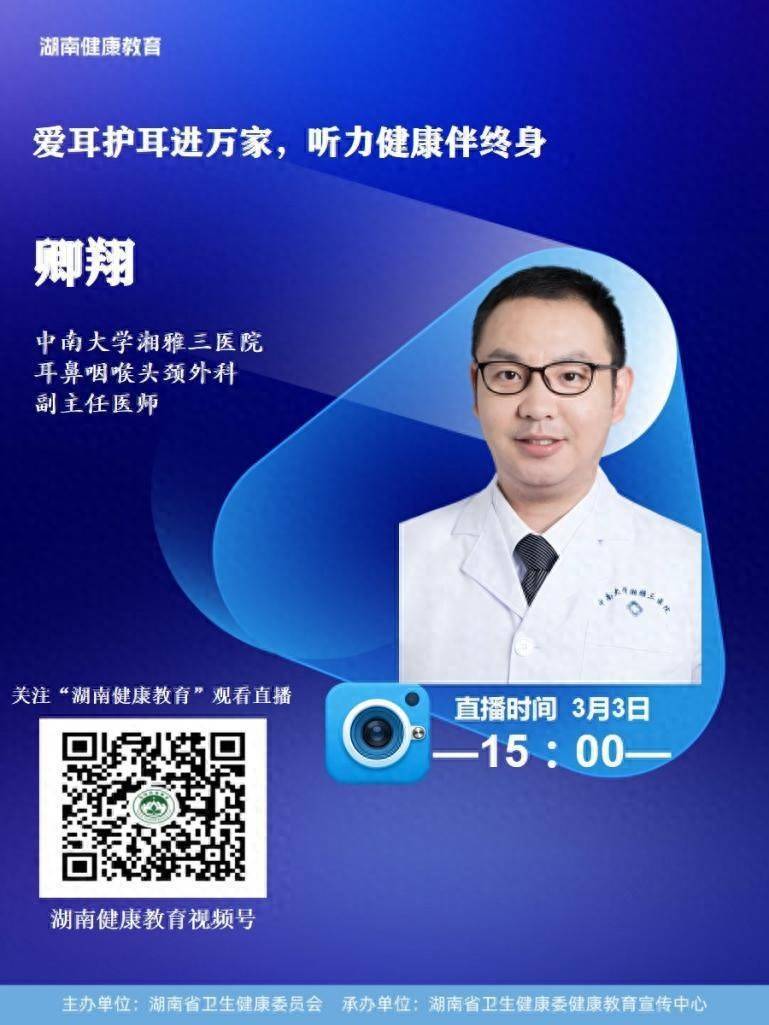 3月3日(星期二)下午 3 点,湖南健康教育微信视频号,邀请到了中南大学湘雅三医院耳鼻咽喉头颈外科副主任医师卿翔,用科学知识为全家人的健康保驾护航!